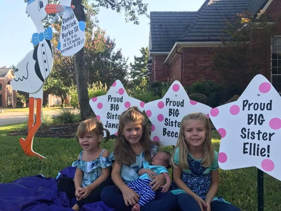 This is one lucky little boy to have three big sisters to welcome him home! A Proud Dad of his first son arranged this Stork rental to surprise his wife when they came home! Welcome Home Daniel!
